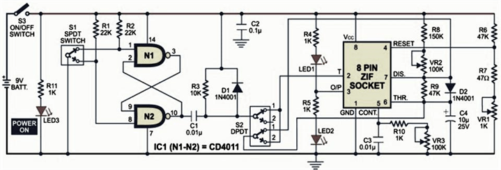 Предлагаемый тестер микросхем 555 прост в изготовлении и использовании, и кроме проверки работоспособности микросхемы в целом, позволяет также проверить функционирование каждого пина NE555. Если описываемый гаджет подтверждает работоспособность микросхемы, то она будет исправно функционировать в любом другом устройстве (при условии, конечно, если устройство корректно спроектировано).