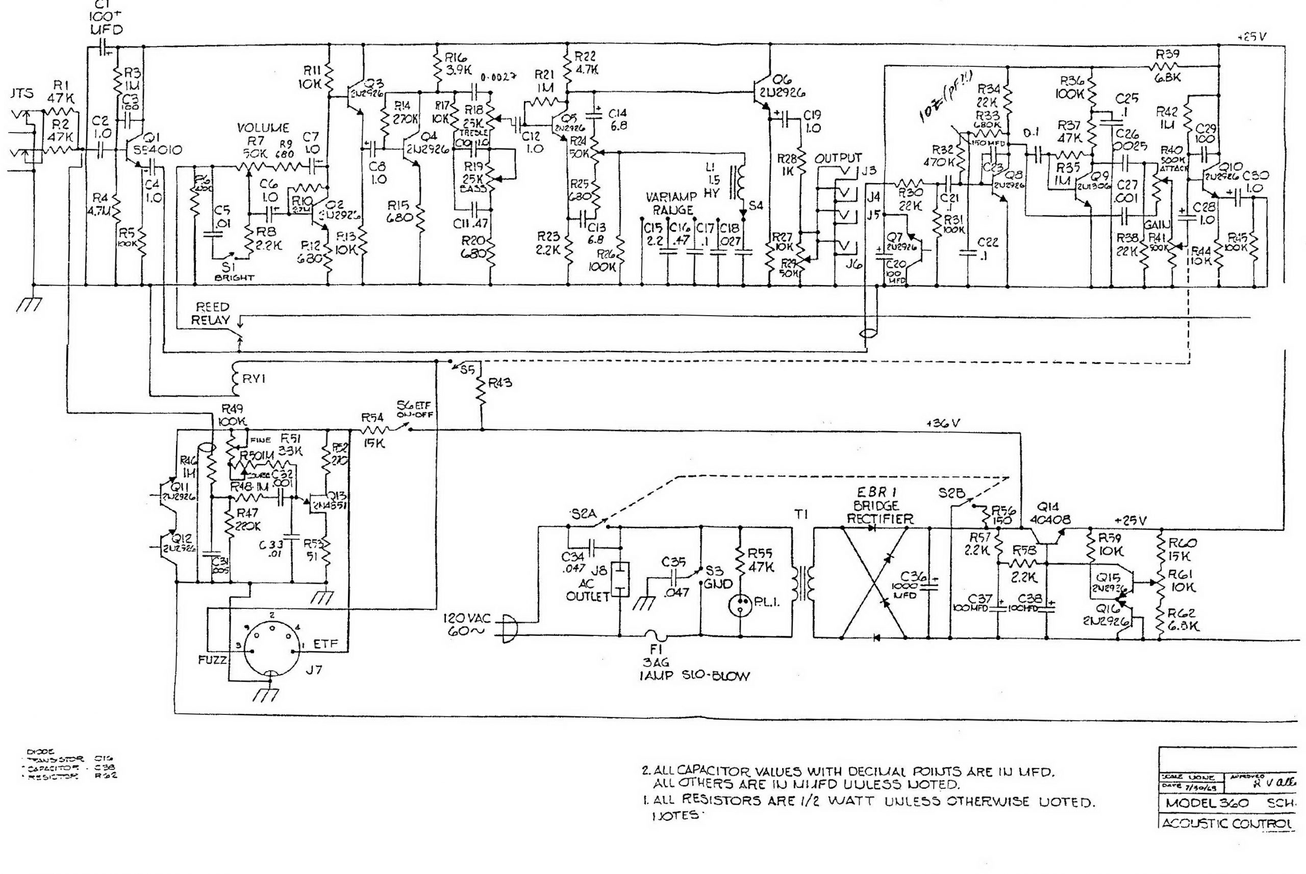 Все статьи блогаГитарная электроникаГитарные усилители и комбикиМузыкальная электроникаAcoustic Control 360 Amp Acoustic Control 360 Amp — это гитарный усилитель мощности на транзисторах. Выпускался с пружинным ревербераторомПринципиальная схема гитарного усилителя Acoustic Control 360 Amp