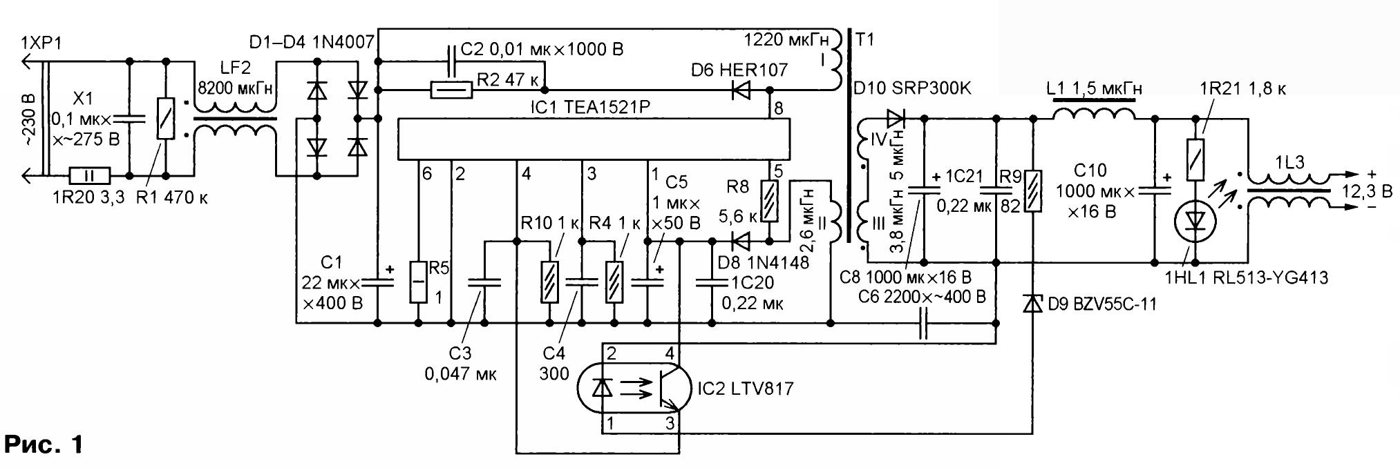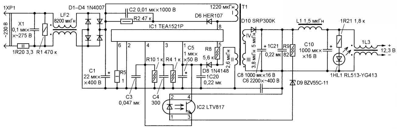 Дроссель 1L3 — пять витков сложенного вдвое многожильного монтажного провода в ПВХ-изоляции, намотанных на кольцевом магнитопро-воде внешним диаметром 15 мм из низкочастотного феррита. Стабилитрон BZV55C-11 заменим любым из 1 N4741 A, TZMC-11, КС211Ж, 2С211Ж, а светодиод RL513-YG413 зелёного цвета свечения — любым аналогичным непрерывного свечения без встроенного резистора, например, из серии КИПД35.