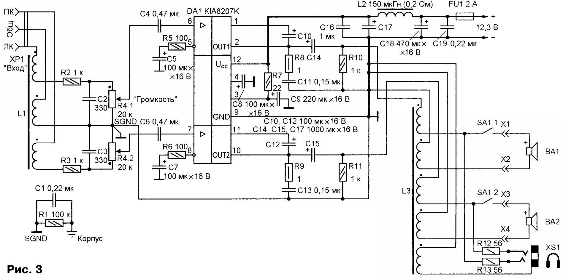 Схема двухкананального УМЗЧ представлена на рис. 3. Его основа — интегральная микросхема KIA8207K, представляющая собой двухканальный двухтактный УМЗЧ с однополярным питанием. Её напряжение питания может быть любым в пределах 6…15 В, максимальная выходная мощность — около 5 Вт в каждом канале, максимальная рассеиваемая микросхемой мощность — 12,5 Вт.