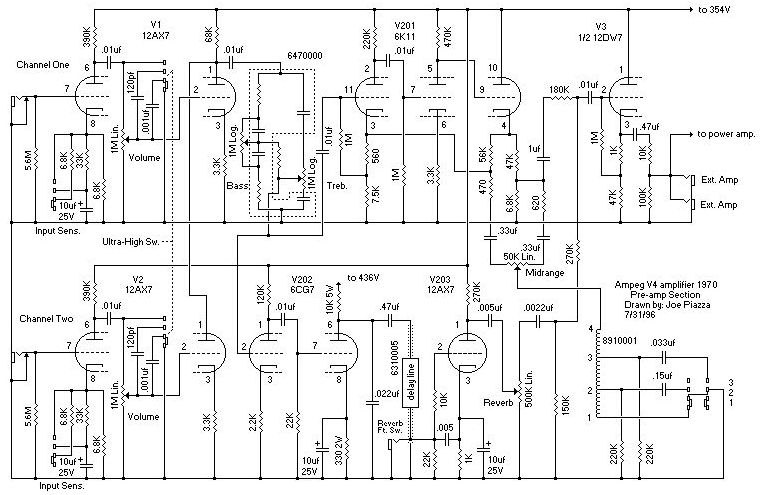 Все статьи блогаГитарная электроникаГитарные усилители и комбикиГитарные эффектыЛамповые СхемыМузыкальная электроникаAmpeg V4 Preamp Принципиальная схема гитарного преампа Ampeg V4 Preamp