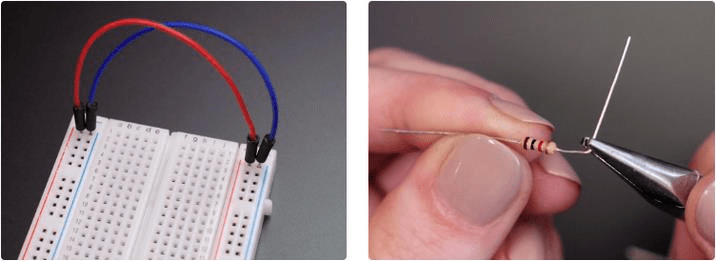 Давайте для начала задействуем вторую пару шин питания на макетной плате: Красной перемычной соедините красные (плюсовые) шины, а синей — синие (земляные) шины. теперь мы имеем удобный доступ к напряжению питания и к земле с другой стороны макекта. Согните выводы ваших резисторов под углом 90 градусов и обрежте концы примерно на 6 мм от изгиба.