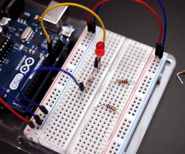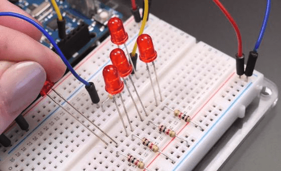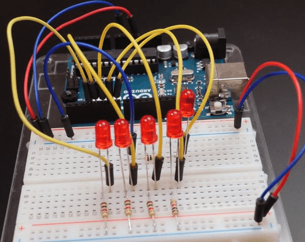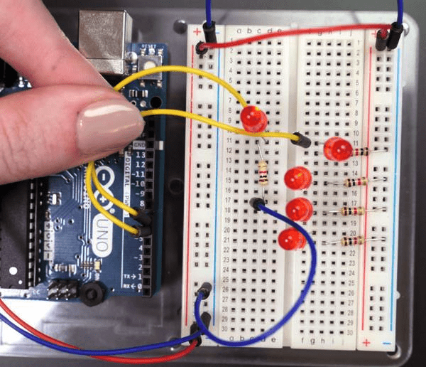Теперь, когда вы знаете, как управлять одним светодиодом, давайте добавим еще несколько! Возьмите остальные красные светодиоды и резисторы 1K. Отключите ваш Arduino от USB / питания. Приучитесь всегда отключать питание перед тем, как вносить изменения в схему.