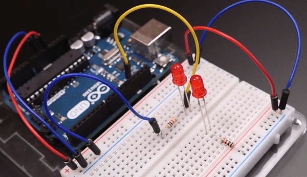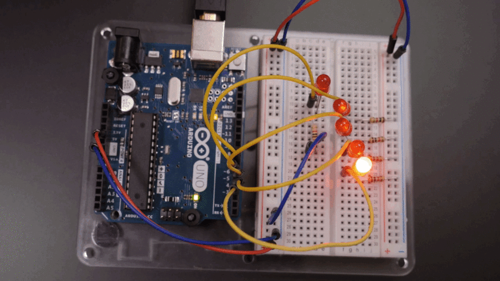 Подключите плату Arduino Uno к компьютеру и загрузите в нее код. Давайте разберемся, как закодировать световую последовательность, более подробно рассмотрев элементы программы:
