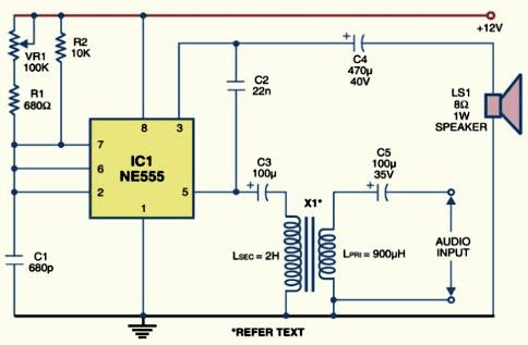 Подстрочным резистором VR1 добиваемся наиболее приятного звучания с минимумом искажений. Важное значение имеет согласование импеданса как на входе, так и на выходе. Трансформатор X1 на входе усилителя служит для согласования выходного сигнала стандартного выхода наушников (телефона, mp3 плеера или звуковой карты компьютера). В качестве нагрузки можно использовать любой громкоговоритель мощностью около 1 Вт и сопротивлением катушки 8 Ом.