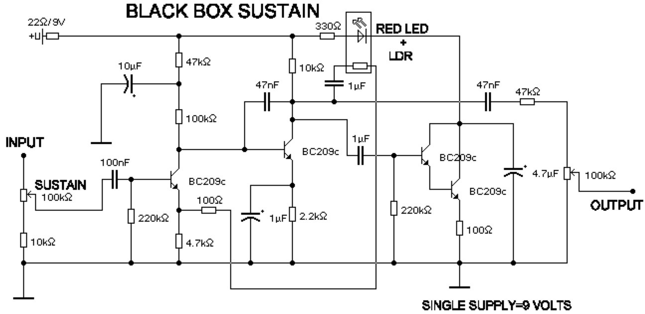Данная схема представляет собой классический оптический компрессор, в котором управление коэффициентом усиления осуществляется с помощью оптрона. При повторении схемы можно использовать самодельный оптрон. Вам потребуется светодиод и фоторезистор. Фоторезистор нужно использовать с сопротивлением 100 — 200 кОм в затемненном состоянии и от 1 до 5 кОм при дневном освещении. Фоторезистор и светодиод помещаем в отрезок термоусадочной трубки черного цвета. Транзисторы BC209 можно заменить на BC549 или на советские КТ3102.