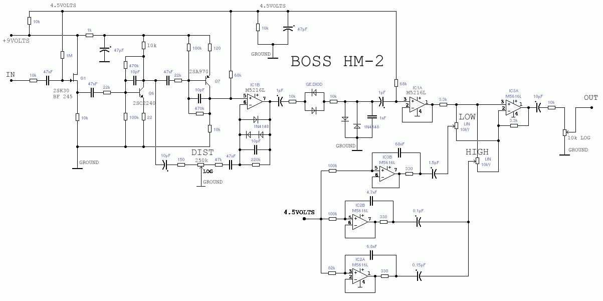 BOSS Heavy Metal HM-2. Классическая педаль эффекта от BOSS. Интересное схемное решение искажающей цепи. Кроме пяти кремниевых диодов 1N4148 используются еще 2 германиевых диода. Схема коммутации не показана. При повторении можно использовать триггерный ‘Bypass’ от любой «босовской» педали, например BOSS DS-1