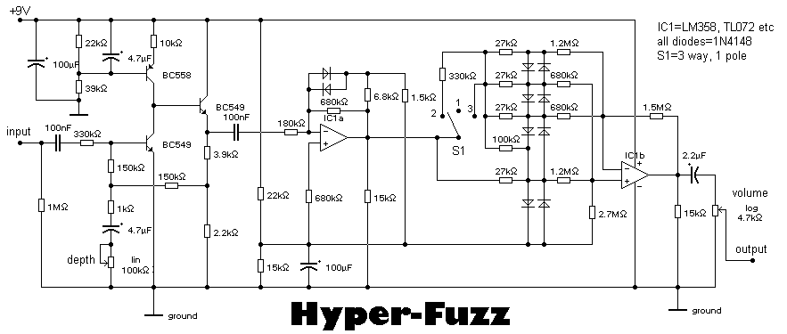 BOSS — Hyper-Fuzz — педаль с необычной двойной схемой цепи искажения сигнала. Первое звено — обычный логарифмический усилитель на операционном усилителе IC1a с двумя встречно-параллельными диодами в цепи обратной связи. Второе звено ограничителя построено на восьми диодах и имеет переключатель выбора степени ограничения на три положения.