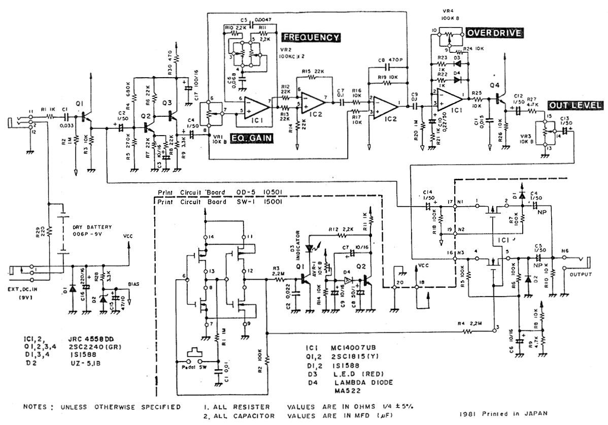 BOSS Overdrive OD-05 — Классический японский Ovrerdrive от Boss. Педаль обладает мягким звуком, за счет симметричного ограничителя в цепи обратной связи операционного усилителя. Последовательно с диодами ограничителя включены резисторы на 1 кОм, что дополнительно смягчает звук.