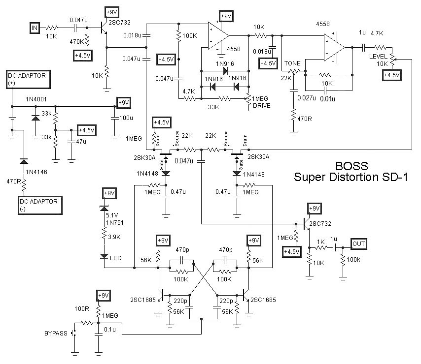 BOSS Super Distortion SD-1 — это стандартная искажающая педаль от BOSS. Стандартный вариант схемы от BOSS с электронным ByPass на триггере и полевых транзисторов в качестве аналоговых ключей. Кроме указанных на схеме можно применить транзисторы BC547-BC549 и операционный усилитель TL062, TL072, TL082. Диоды в ограничителе — 1N4148. При питании педали от батареи следует отдать предпочтение экономичным ОУ TL062, потребляющим небольшой ток от источника питания.