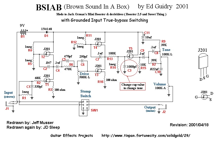 Brown Sound In a Box — оригинальная схема overdrive, собранная полностью на полевых транзисторах J201. Питание педали автоматически включается когда вы вставляете джек провода от гитары во входное гнездо. Применена механическая схема bypass на обычной стандартной «примочечной» кнопке