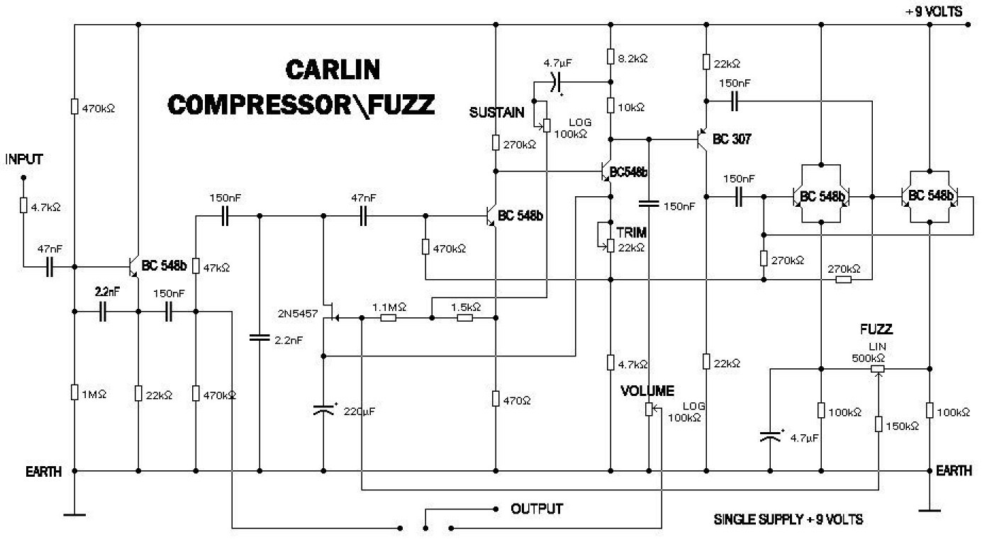 Эффект Carlin Compressor Fuzz интересен тем, что к компрессии можно подмешать овердрайв. Педаль имеет стандартные для эффектов компрессоров регуляторы Sustain и Volume, а также третий регулятор “Dist”, позволяющий добавить искажений в звучание педали. В связи с этим педаль идеальна для исполнения солирующих партий.