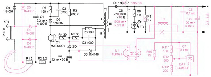 Для повышения стабильности выходного напряжения и возможности его регулировки на втором этапе доработки введена микросхема DA1 (параллельный стабилизатор напряжения). Управление преобразователем и обеспечение гальванической развязки реализованы с помощью транзисторной оптопары U1. Для подавления импульсных помех с частотой автогенератора дополнительно установлен фильтр L1C6C8. Резистор R9 удалён