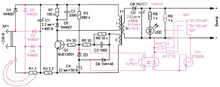 В оригинальном ЗУ в выходном выпрямителе применён диод 1N4937, который заменён диодом Шотки 1N5818, что позволило увеличить выходное напряжение