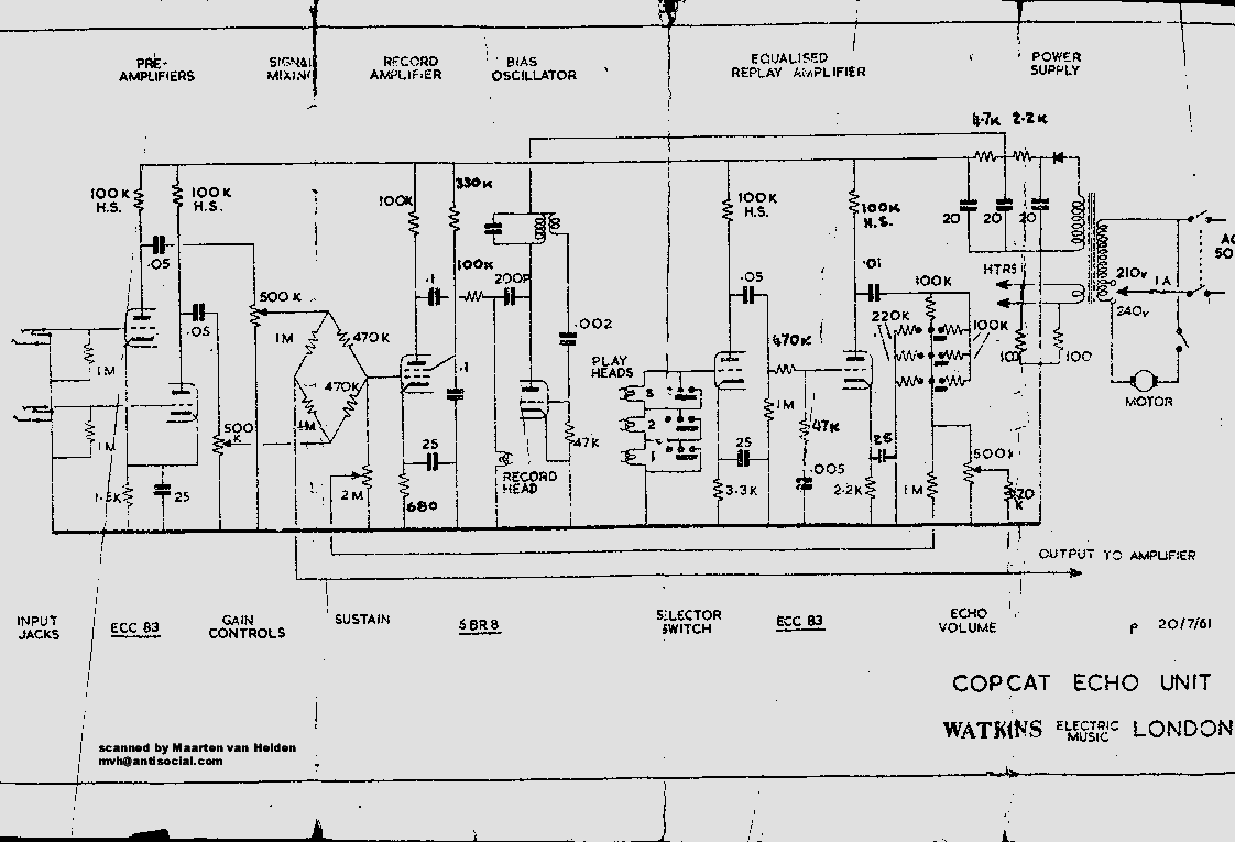 Copycat Echo Unit представляет собой классический ленточный ревербератор. устройство собрано на трех лампах типа ECC83 (12AX7, 6Н2П). На двух триодах первой лампы собран предварительный усилитель и микшер. На второй лампе реализован усилитель записи и генератор тока стирания — подмагничивания. На третей лампе реализован усилитель воспроизведения. В механической части ревербератора можно использовать лентопротяжный механизм от старого бобинного магнитофона. Потребуется доработать блок головок, добавив еще 2 головки воспроизведения. записывающую и стирающую головку можно использовать штатные от модифицируемого магнитофона. если используется магнитофон с универсальной головкой, ее будем использовать как записывающую. В такой магнитофон придется установить дополнительно три воспроизводящих головки. теоретически можно использовать только одну воспроизводящую головку, но это сузит функционал ревербератора.