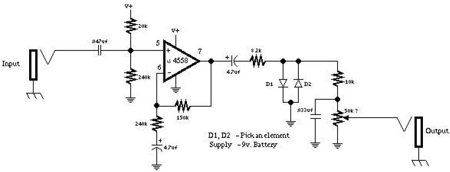 Dan Armstrong Blue Clipper. Классический Distortion на часто используемом в гитарных схемах операционном усилителе 4558. Ограничитель собран на двух включенных встречно-параллельно диодах. Характер звука в этой схеме зависит от свойств используемых диодов. Вы можете поэкспериментировать с разными диодами.