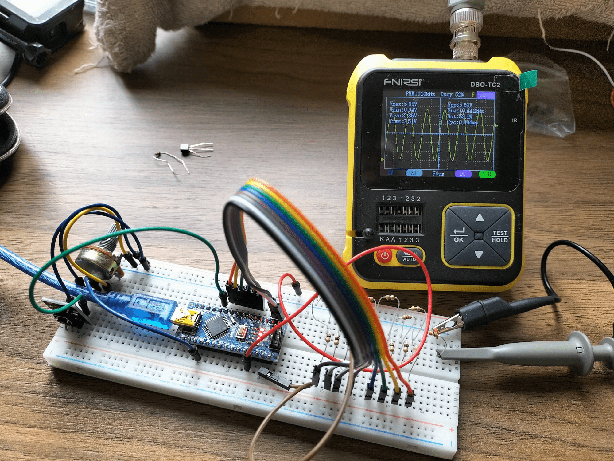 Я собрал этот учебный генератор на макетной плате breadbord на основе дешевого китайского клона Arduino Nano. Первый вариант был сделан с платой Arduino Uno, но потом я заменил Uno на Nano просто с целью экономии места. Nano удобна тем, что ее можно вставить непосредственно в Breadboard. Платы Arduino Uno и Nano совместимы между собой и практически отличаются только размерами (есть также небольшие схемные отличия, несущественные для нашего проекта). Так что вы можете использовать либо Nano либо Uno, в зависимости от того что есть в наличии.