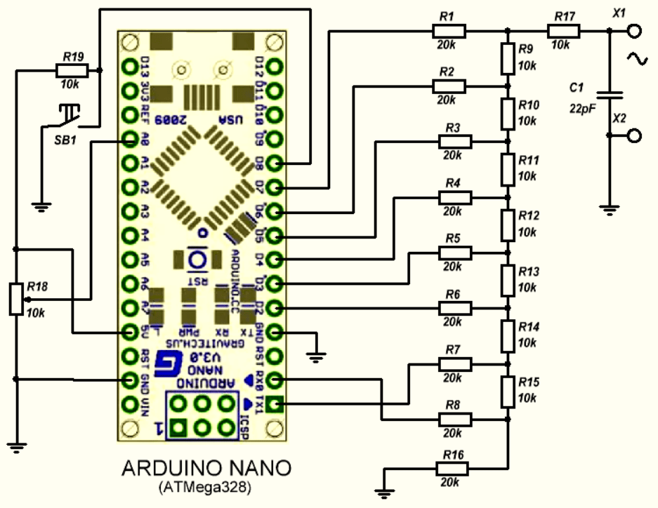 В качестве цифро-аналогового преобразователя используется простая и дешевая схема R2R на резисторах. Регулировка частоты осуществляется переменным резистором, подключенным к АЦП платы Arduino. Нужно иметь в виду, что в этом учебном генераторе качество выходного сигнала очень сильно зависит от точности подбора резисторов самодельного R2R преобразователя. Чем точнее будут номиналы резисторов, тем более «правильная » будет у нас синусоида на выходе.