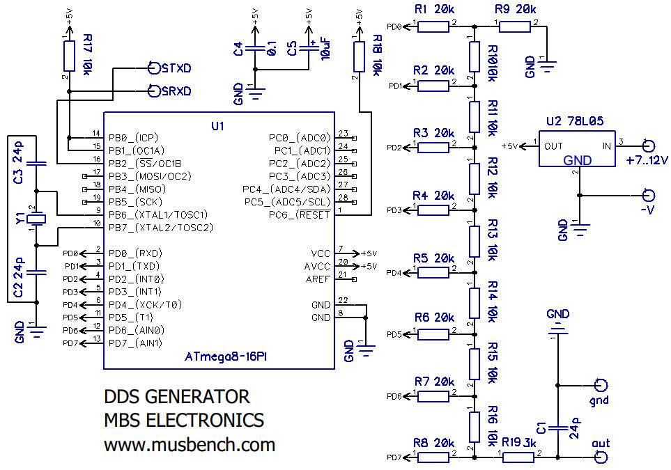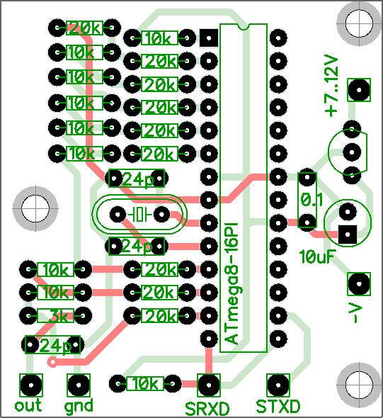 Параллельный R2R цифроаналоговый преобразователь на резисторах R1 — R19 подключен к выводам порта D микроконтроллера.