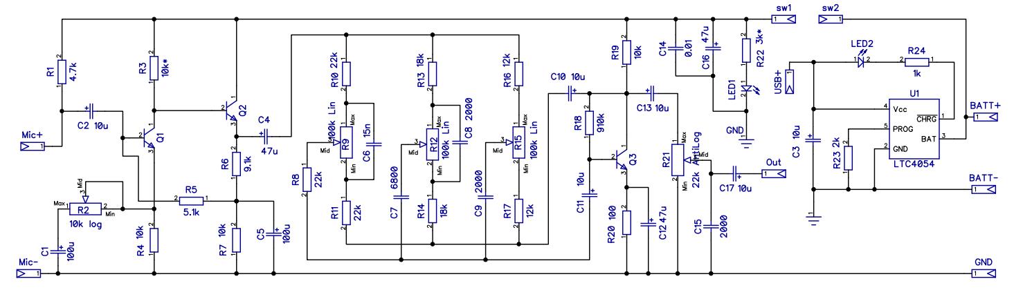 Была поставлена задача сделать очень простое и экономичное устройство с питанием от встроенного Li-Ion аккумулятора, с возможностью подзарядки от USB компьютера, телефонной зарядки или повербанка. Я предпочитаю микрофонные предусилители с батарейным питанием, так как они обеспечивают полное отсутствие помех по цепям питания. Тем не менее этот усилитель может фактически питаться от USB, то есть он может работать во время зарядки его встроенного аккумулятора.