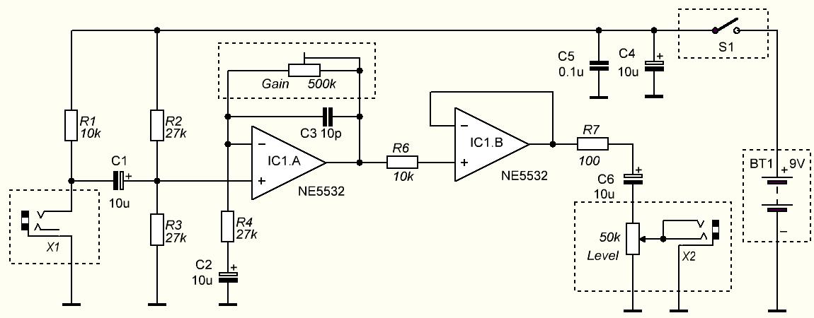 Усилитель собран на базе сдвоенного малошумящего операционного усилителя NE5532. Входное и выходное гнезда рассчитаны на подключение стандартного кабеля со штекером диаметром 3.5 мм типа «миниджек». Элементы, обведенные на схеме пунктиром, устанавливаются на корпусе устройства. остальные компоненты размещены на небольшой односторонней печатной плате.
