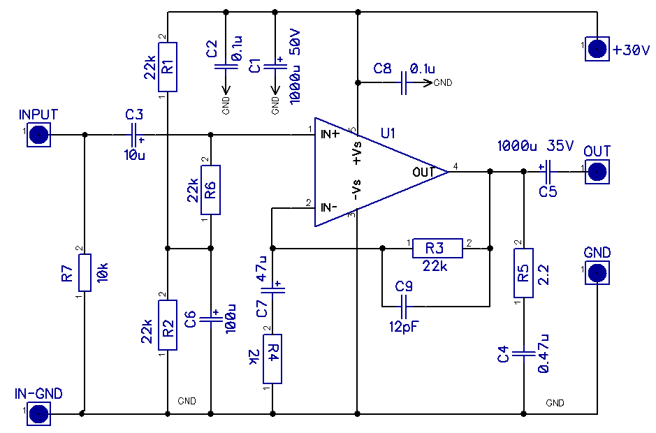 В качестве оконечного усилителя я выбрал простой усилитель на очень распространенной и дешевой микросхеме TDA 2050. В данном усилителе микросхема работает с однополярным источником питания напряжением 30 вольт. использование однополярного питания несколько ухудшает параметры усилителя, но в данной конструкции это не имеет значения.