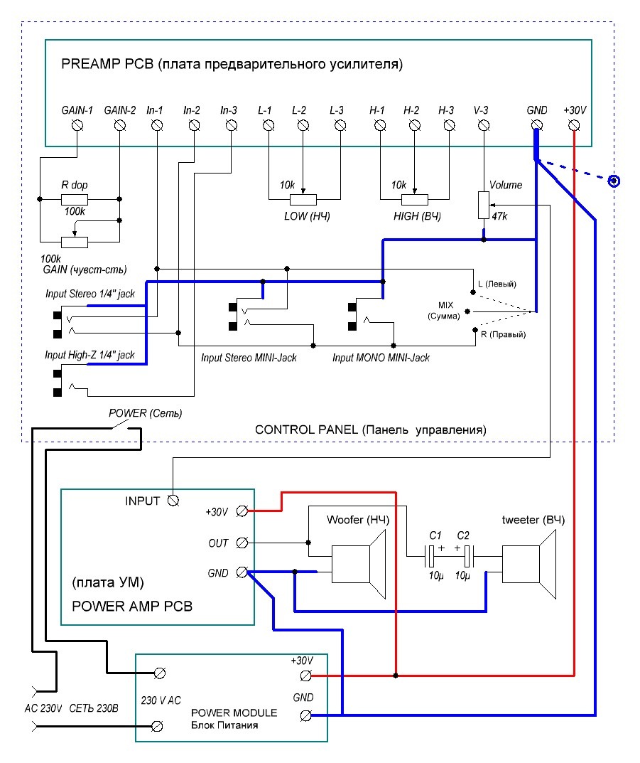 После изготовления всех модулей комбика (блока питания, преампа, усилителя мощности и панели управления) необходимо произвести сборку устройства. Ниже приведена схема соединений между платами и блоками комбика.