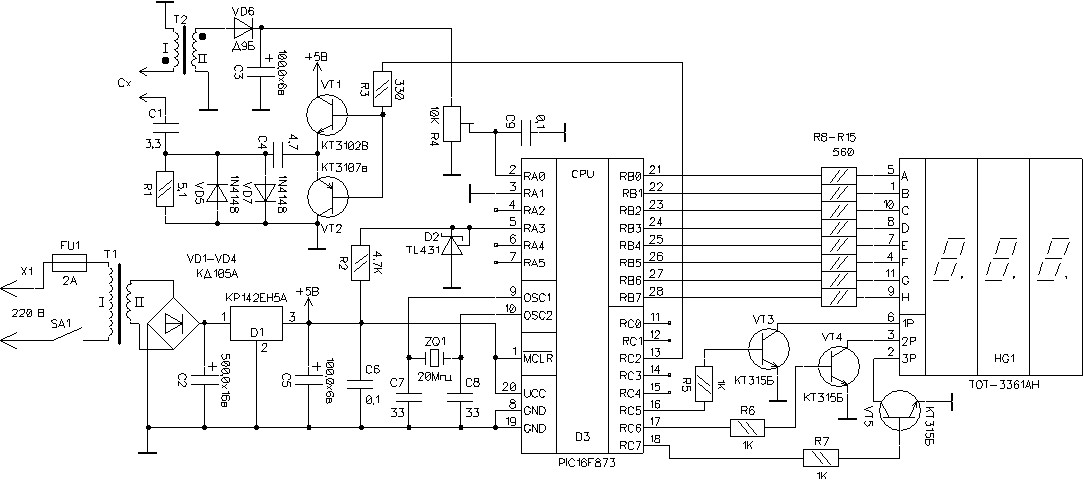 Далее переменное напряжение, через конденсатор С1 и измеряемый конденсатор Cx поступает на первичную обмотку повышающего трансформатора Т2. далее импульсы снимаются со вторичной обмотки и выпрямляются диодом VD6, после чего полученное пульсирующее напряжение сглаживается конденсатором С3. Далее сформированное постоянное напряжение через подстроечный резистор R4 поступает на вход аналого-цифрового преобразователя микроконтроллера D3. Конденсатор С9 устраняет возможные высокочастотные помехи.