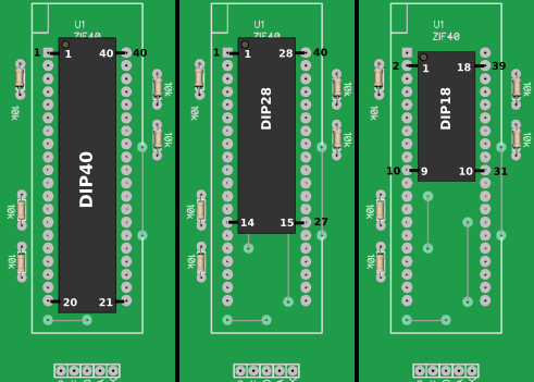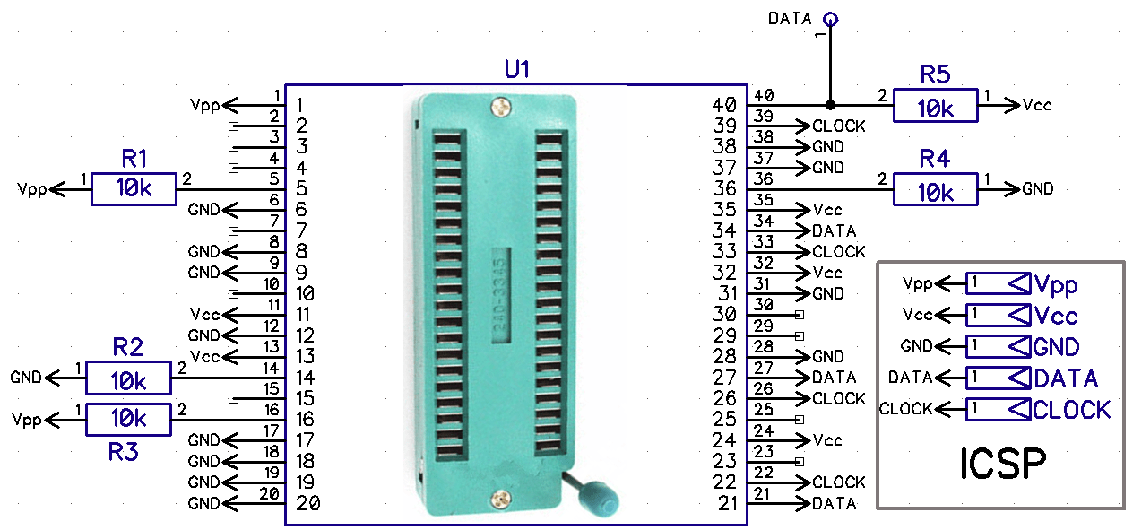 Это принципиальная схема адаптера. Как видим, здесь только 40-пиновая панель с нулевым усилием (ZIF-панель) пять резисторов и штырьки разъема ICSP для подключения к программатору. Если у вас нет ZIF панельки, можно установить цанговую 40-пиновую панель или в крайнем случаю обычную, но срок службы ее ограничен.