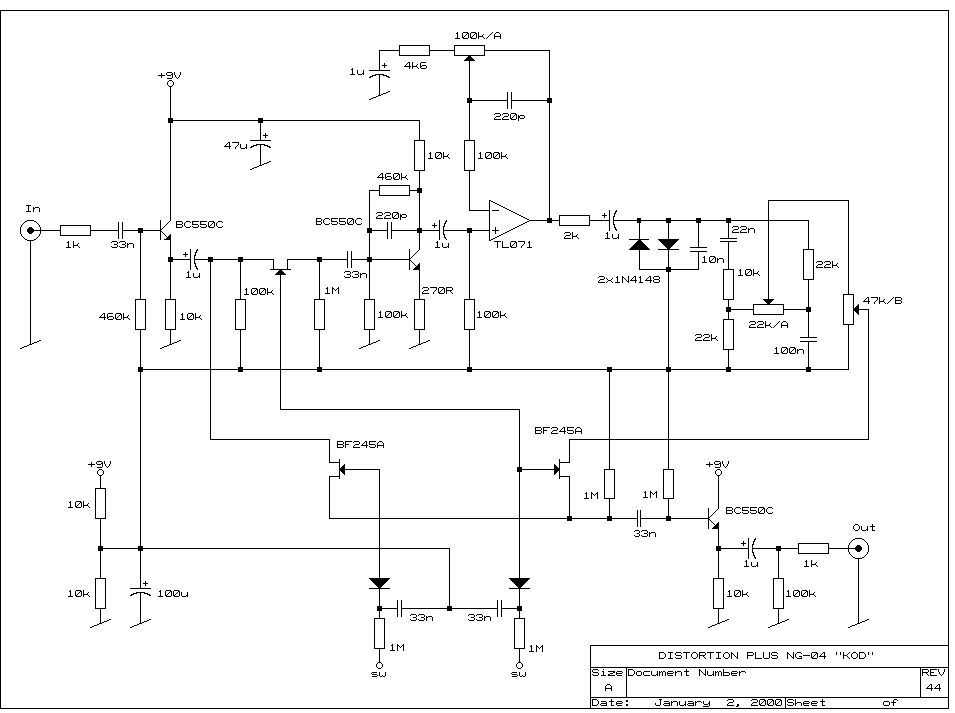 Простая педаль Distortion на одном операционном усилителе. «Байпасс» выполнен на полевых транзисторах BF254A. Управляющие напряжения для переключения нужно подавать на входы SW. В качестве управляющей схемы можно использовать классический триггер на двух биполярных транзисторах. также вполне возможно управление от микроконтроллера, если использовать этот узел в составе более сложного преампа.