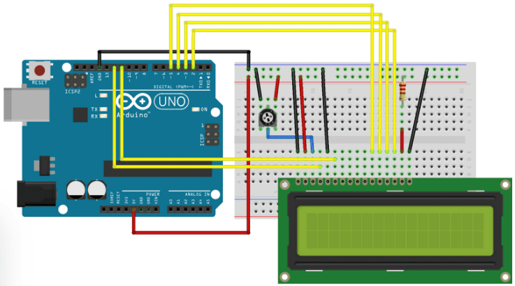 На следующей принципиальной схеме показано, как подключить дисплей к модулю Arduino . Вывод RS ЖК-дисплея подключен к выводу 12 Arduino. Вывод R/W подключен к земле. Вывод 11 Arduino подключен к выводу сигнала включения ЖК-модуля. В этом проекте ЖК-модуль и модуль Arduino взаимодействуют в 4-битным режимом. Следовательно, для обмена информацией с дисплеем используются его лини от DB4 .. DB7. Процесс очень простой, он требует меньше соединительных проводов, однако мы можем максимально использовать потенциал ЖК-модуля.