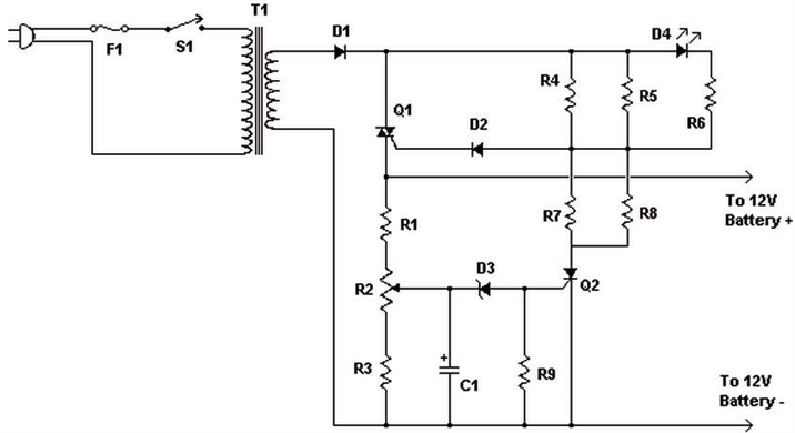 Силовой трансформатор Т1 — это трансформатор с первичной обмоткой, рассчитанной на напряжение в сети вашего региона (220, 120 и т.д.). На вторичной обмотке должно быть напряжение в районе 12 вольт. Если использовать вторичную обмотку с напряжением 16 — 18 В, то это позволит вам заряжать 16-вольтовые батареи, которые, впрочем, достаточно редки и используются в гоночной технике. При отключении питания необходимо отключать аккумулятор, иначе он медленно разрядится через выходные цепи схемы.