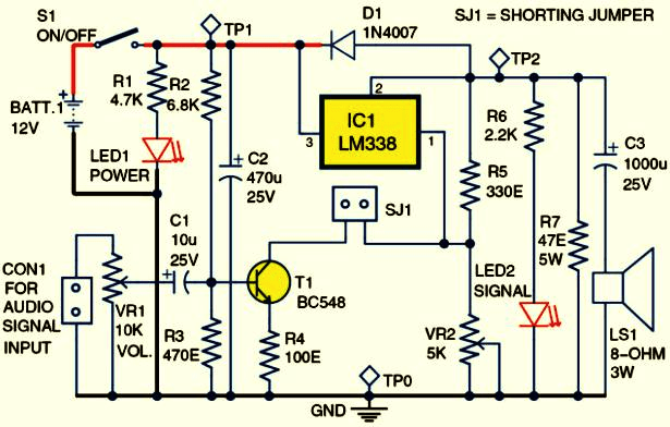 Кроме микросхемы LM338 на принципиальной схеме вы видите транзистор BC548 (T1), несколько резисторов, два потенциометра (VR1 и VR2), громкоговоритель LS1 и немного других компонентов.