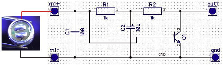 Резисторы R1 и R2 устанавливают режим работы транзистора по постоянному току. Для того, чтобы исключить из цепи отрицательной обратной связи переменную составляющую используется электролитический конденсатор C2. Если убрать этот конденсатор, то усиление очень сильно снизится. От емкости этого конденсатора зависит количество низких частот, которые воспроизводит наш микрофон. Чем больше емкость тем более низкие частоты способен усиливать каскад. Я решил слегка обрезать самые низкие частоты (при записи голоса они только мешают) и установил танталовый конденчсатор емкостью 10 микрофарад. Вы можете использовать конденсатор до 100 мкф.