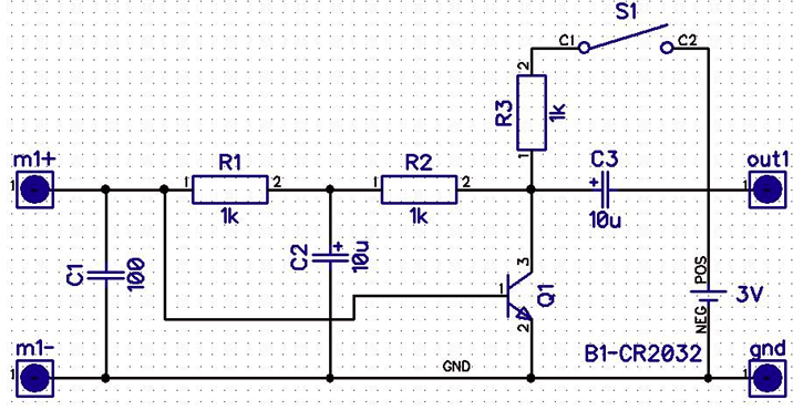 Рис. 2 Схема усилителя с питанием от литиевой батарейки CR2032