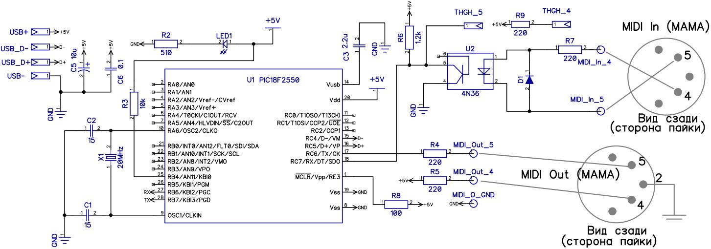 Оптрон U2 использован типа 4N36 d 6-пиновом корпусе. Можно применить любой совместимый по распиновке оптрон этой серии. Для стабильной работы MIDI входа, возможно, придется подобрать сопротивление резистора R6. В случае с 4N36 у меня получилось оптимальное сопротивление в районе 1…1,2кОм. Дополнительные пины, обозначенные на схеме как THHG_5 и THHG_4 я применял для установки дополнительного гнезда MIDI THROUG. Это гнездо служит для непосредственной передачи MIDI сигнала с MIDI IN на этот самый MIDI THROUGH, и по моему мнению в случае с компьютерным интерфейсом особого смысла не имеет, поэтому можно его не устанавливать.