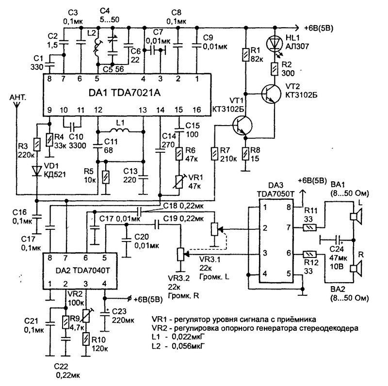 Собственно приемник собран на интегральной микросхеме TDA7021 (даташит) производства PHILIPS — NXP Semiconductors. Микросхема представляет собой интегральный радиоприемник для портативных применений.