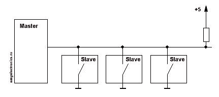 Что это нам дает? Простеший пример — сигнал готовности. Есть несколько блоков одного устройства, каждый из которых работает по своему алгоритму и, например, требует начальную инициализацию. Чтобы основной блок понял, что все остальные блоки закончили инициализацию и подготовились он «слушает» линию связи. В качестве сигнала готовности — блок отпускает линию. Когда каждый блок пройдет инициализацию, то линия примет высокий уровень и это будет сигналом полной готовности устройства.