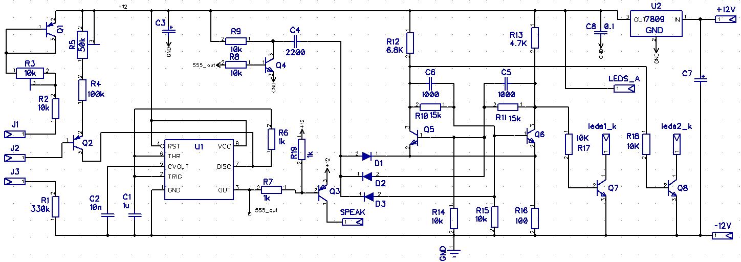 На микросхеме таймера 555 собран генератор коротких импульсов, которые снимаются с вывода 3 микросхемы. Через резистор R7 импульсы поступают на базу ключа на транзисторе Q3, к коллектору которого подключен громкоговоритель SPEAK. На схеме громкоговоритель не показан (так же как и потенциометр регулировки темпа). Схема рисовалась для разводки печатной платы, а динамическая головка устанавливается на корпусе метронома, а не на печатной плате. Поэтому ее нет на моей схеме. Головка подключается к на контакт платы SPEAK, а второй ее вывод соединяется с контактом -12V на плате.