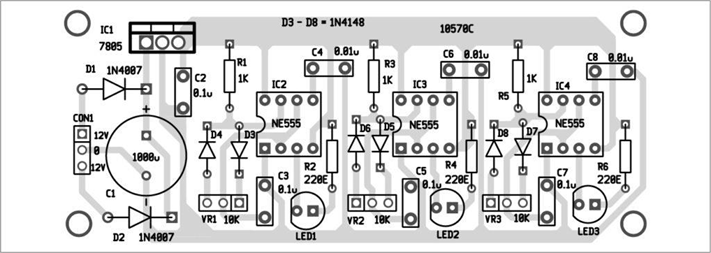Принципиальная схема устройства управления RGB светодиодами на основе таймера 555 приведена на рис.2. Устройство питается от сети 220 вольт через понижающий трансформатор. Вторичная обмотка трансформатора должна иметь отвод от середины, каждая половинка вторичной обмотки рассчитана на напряжение AC 12 В (можно использовать одну обмотку на 12 В. Тогда вместо диодов D1 и D2 можно применить обычный диодный мостик. Пим. переводчика). В качестве стабилизатора напряжения на 5 В использован регулятор напряжения 7805.