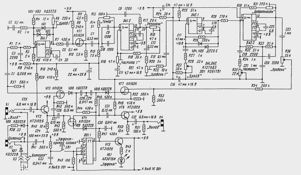 Довольно «навороченная» педаль Distortion. Схема была когда-то опубликована в журнале «Радио»