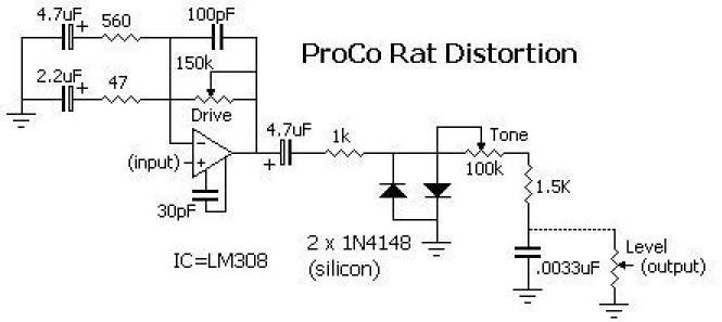 Простая схема Distortion. В качестве усилителя применена микросхема LM308. Ограничение сигнала и значит обогащение его гармониками производится двумя включенными встречно-параллельно кремниевыми диодами 1N4148. Потенциометр DRIVE регулирует усиление и соответственно, степень искажения сигнала. Потенциометр включен в цепь отрицательной обратной связи операционного усилителя. Второй потенциометр TONE регулирует тембр звука. регулятором LEVEL можно настроить громкость звучания педали.