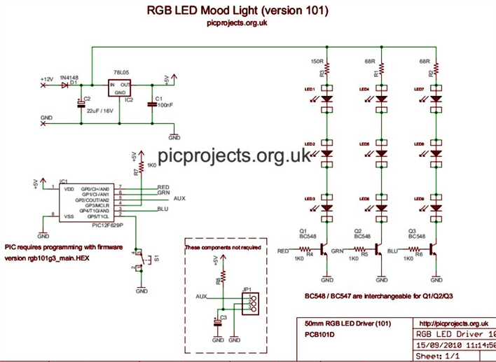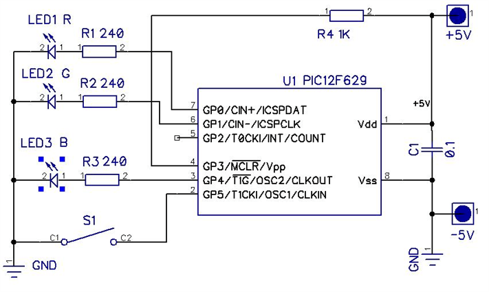 LED1, LED2 и LED3 это соответственно красный, зеленый и синий компоненты нашего RGB светодиода. Вывод общего катода соединяется с минусом питания. Светодиоды подключены в выводам микроконтроллера через токоограничивающие резисторы R1..R3 сопротивлением 240 Ом. резистор R4 сопротивлением 1…10 килоом подтягивает вывод MCLR контроллера к плюсу питания. Это необходимо для правильной работы программы. Кнопкой S1 можно мерять последовательности световых эффектов. (См. далее)