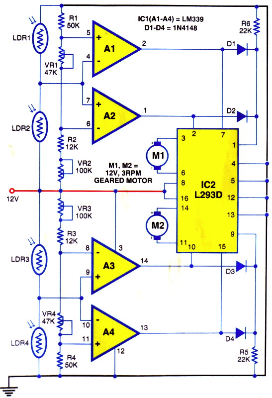 Схема устройства содержит микросхему LM339, которая представляет собой четыре аналоговых компаратора в общем корпусе. Двумя моторами управляет специализированная микросхема L293D — сдвоенный H-мост. Кроме микросхем принципиальная схема содержит несколько дискретных элементов. В качестве датчиков интенсивности освещения используются фоторезисторы LDR1 — LDR4.Эти фоторезисторы определяют положение солнечной панели относительно лучей солнца.