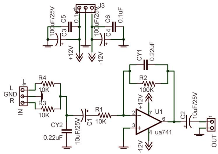 Фильтр собран на классическом операционном усилителе 741. Можно использовать любой ОУ общего назначения. Лично я отдал бы предпочтение малошумящему NE5534 или половинке NE5532. Можно использовать также дешевые TL071, TL081 и т.д. Частот среза фильтра лежит в области 25-80 герц. Для питания фильтра необходимо использовать стабилизированный двухполярный источник напряжением +/- 12 в.