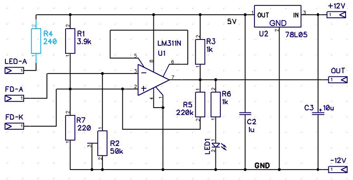 Фотодиод и светодиод подсветки на схеме не показаны. Они подключаются к соответствующим контактам платы и закреплены на специальных креплениях вне печатной платы. В данной схеме фотодиод включен между инвертирующим и неинвертирующим входами компаратора. Анод фотодиода подключается к контакту FD-A печатной платы, а катод — к контакту FD-K.