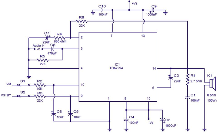 Микросхема TDA7294 (см. Даташит здесь) — это интегральный звуковой усилитель класса AB, разработанный специально для приложений Hi-Fi.