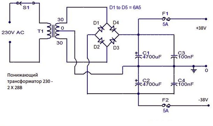 - Для получения выходной мощности 100 Вт напряжение питания должно быть +/- 38 В.