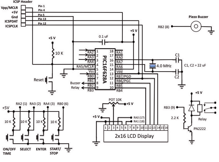 Для управления внешним устройством использовано электромагнитное реле. Обмотка реле должна быть рассчитана на напрядение 5V. Микроконтроллер управляет реле через ключ на транзисторе PN2222. Контакты реле должны быть рассчитаны на ток, потребляемый управляемым устройством. Кнопки управления подключены к портам микроконтроллера RB0, RA2, RA3 и RA4.