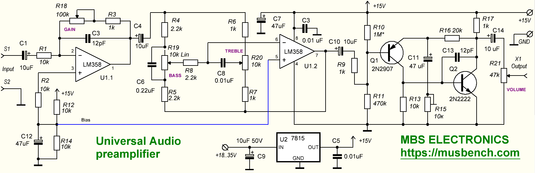 Усилитель собран на одном сдвоенном операционном усилителе LM358 (содержит два ОУ в одном 8-выводном корпусе) и двух транзисторах 2N2222 и 2N2907
